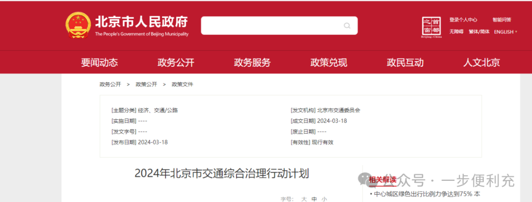 3月18日,北京市人民政府发布《2024年北京市交通综合治理行动计划》(以下简称《计划》)。 《计划》指出,优化车辆能源结构。推进落实新能源汽车推广应用实施方案。持续推进出租车“油换电”。出台实施国IV排放标准营运柴油货车淘汰和货车新能源化方案。加强新能源汽车充换电基础设施建设管理,推进在交通枢纽场站、公路沿线建设充电设备设施。实现自动泊车、充电设施等功能纳入停车楼建设标准体系。研究建设政府主导的全市统一充电桩管理服务平台。 - 以下为原件 - 一、指导思想 深入贯彻习近平总书记对北京一系列重要讲话和指示批示精神,全面贯彻党的二十大和二十届二中全会及市委十三届四次全会精神,以推动首都交通高质量发展为主题,以“便捷、顺畅、绿色、智慧、安全”为工作目标,加快构建以轨道交通为骨干、地面公交为支撑、多种出行方式为补充,结构合理、衔接顺畅、便捷有序的综合交通体系,提高交通精细化治理水平。中心城区高峰时段平均道路交通指数力争控制在6.0左右,中心城区绿色出行比例力争达到75%。 二、重点工作任务 (一)便捷方面 围绕轨道交通,优化调整地面公交、共享单车、驻车换乘等接驳方式,加快实现轨道交通出入口应通尽通,应通早通。 1.加快轨道新线建设。开通轨道交通3号线一期(东四十条-东风)、12号线(四季青-东风)、昌平线南延一期(蓟门桥站及站后区间)3条(段)线路45.3公里。开工建设轨道交通1号线支线。研究论证规划建设地下深隧轨道交通快线的可行性。开展规划建设四惠地区与城市副中心之间轨道交通快线的前期研究。 责任单位:市重大项目办、市交通委、市规划自然资源委、市发展改革委、各有关区政府、京投公司、市地铁公司 2.优化提升既有轨道线网。增开运营车站和出入口,开通昌平线南延朱房北站,开通亦庄线亦庄火车站站B口和C口、大兴线新宫站D口、14号线阜通站A2口、昌平线南延学院桥站D2口。完成10号线信号系统车地无线通信网络化优化工程。加强首都机场线服务城市通勤功能,开工建设望京南站。 责任单位:市重大项目办、市交通委、市发展改革委、市财政局、京投公司、市地铁公司、京港地铁公司、京城地铁公司 3.推动市郊铁路公交化运营。推进建设城市副中心线整体提升工程(北京西-良乡)。研究利用京沈高铁提升中心城和怀柔科学城、雁栖湖国际会都通达便利性。 责任单位:市发展改革委、市重大项目办、市生态环境局、市交通委、市重点站区管委会、各有关区政府、市域铁路集团公司、中国铁路北京局集团有限公司 4.推动站城融合。研究建立轨道交通场站周边土地“带条件、带方案招拍挂”机制,打通“轨道+土地”融合发展路径。推动容积率指标和多种城市功能向轨道交通车站周边梯次化聚集,提升轨道交通站点周边人口、岗位覆盖率和步行可达性。加强轨道交通三期规划线路和站点周边一体化开发,加快建设霍营、城市副中心站等第一批71个轨道微中心。研究西郊线沿线交通组织整体提升,推进沿线交叉路口优化、巴沟站停车楼建设等工作。 责任单位:市规划自然资源委、各有关区政府、经开区管委会、市交通委、市发展改革委、市重大项目办、市公安局公安交通管理局、京投公司、公交集团 5.推进轨道公交“两网融合”。围绕轨道线路和站点布局,优化公交线网,消减与轨道长距离重复线路30条,调整合并30条。新开连接轨道车站和社区的微循环线路不少于30条。优化调整二环路公交线和站点设置并推动车辆小型化。在沙河站、天通苑北站、天通苑站等大客流车站,增加地面公交运力投放,开行大站快车和“点对点”快车,缓解轨道客流压力。持续优化公交与轨道换乘站点布局,全市轨道车站出入口换乘距离小于50米的公交站点占比由86%提高到88%。 责任单位:市交通委、市公安局公安交通管理局、市规划自然资源、市园林绿化局、各区政府、经开区管委会、公交集团 6.推动地面公交提质增效。以调度指挥扁平化和区域调度集中化为核心,加快公交运营管理体制改革,弱化以车队为基本单元的运营管理模式,加快实现车辆、场站和人员等资源统筹共享和复合利用。增加定制化、多样化公交服务,开通通医、通游线路50条。有序推动通学车扩大试点,春季开学扩大至城六区、通州区和大兴区。完成前门、天桥、北京站、永定门、东直门、德胜门6处长途公交场站疏解外迁,完成望京、六里桥西、铁匠营等外围承接公交场站用地征拆、移交。 责任单位:市交通委、市公安局公安交通管理局、市财政局、市国资委、各区政府、经开区管委会、市委教工委、市教委、市卫生健康委、市文化和旅游局、公交集团 7.加强机动车停车设施供给与管理。加大中心城区停车设施建设力度,利用疏解腾退空间新增停车位1.2万个,利用人防工程新增停车位5000个。研究出台有偿错时共享停车合同范本,新增错时共享停车位1万个,开展错时共享停车信息化服务试点。加快停车楼建设,加大老旧厂房、低效楼宇改造为停车楼的政策支持力度。强化停车楼建设规划,推动新建园区同步配建停车楼。围绕五环路外轨道交通站点布局规划建设驻车换乘停车场。严管核心区违法停车,扩大管理和执法时间、空间覆盖,加强“僵尸车”清理。严格落实交通秩序维护“门前三包