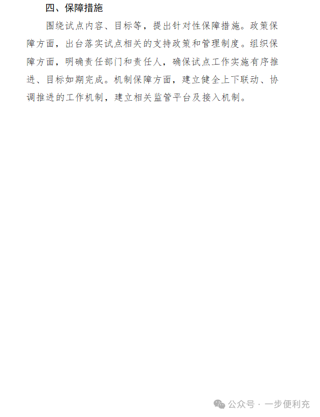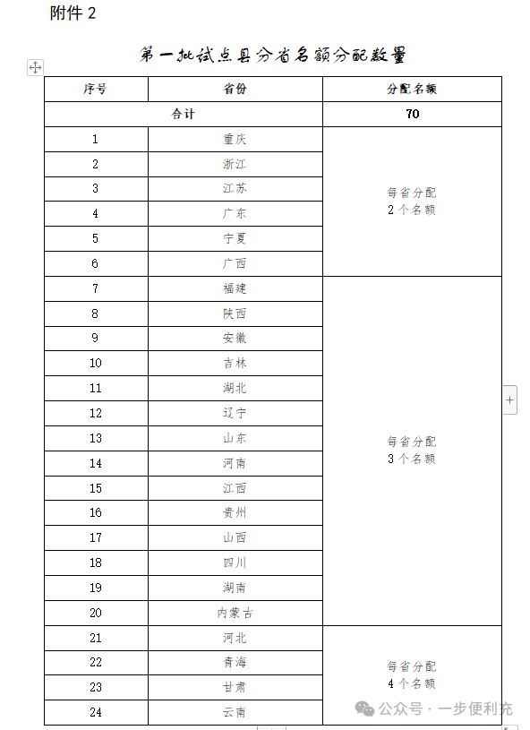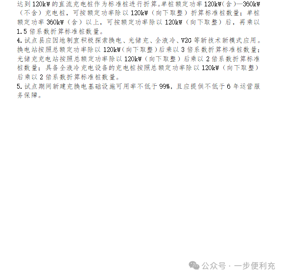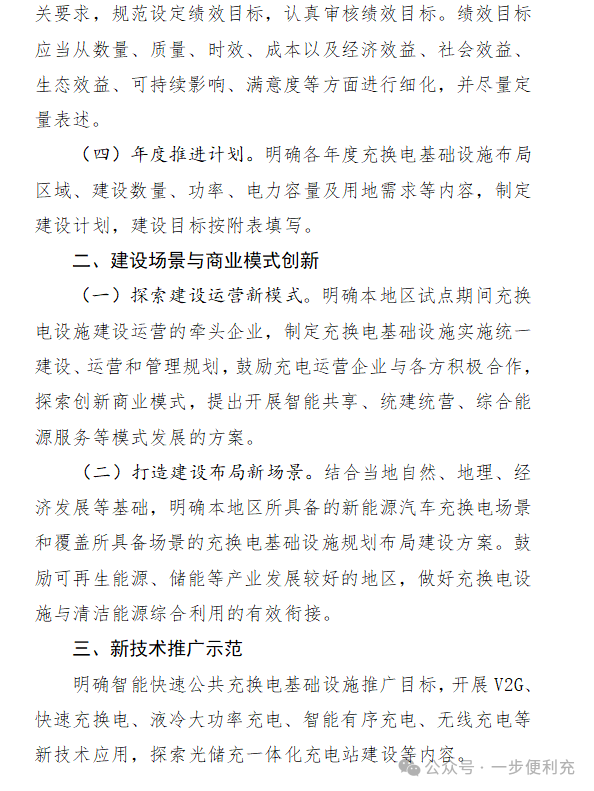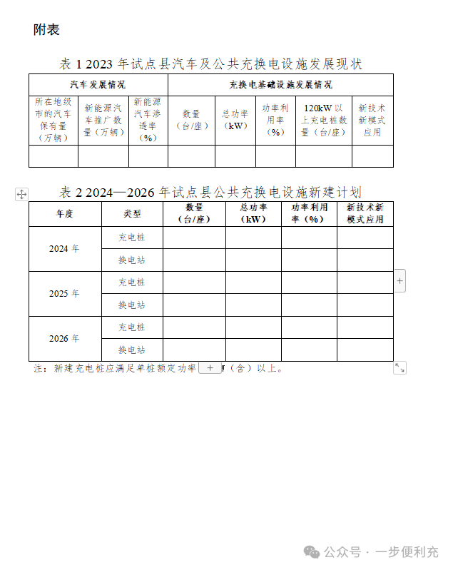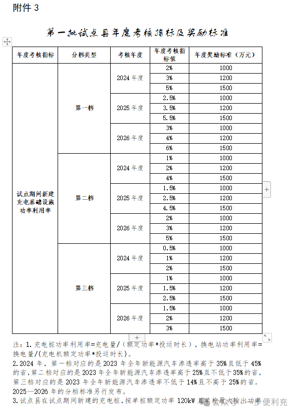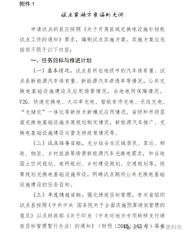 -原文如下- 有关省、自治区、直辖市财政厅(局)、工业和信息化主管部门、交通运输厅(局、委): 为贯彻落实党中央、国务院有关决策部署,根据《中共中央 国务院关于学习运用“千村示范、万村整治”工程经验有力有效推进乡村全面振兴的意见》有关精神,加快补齐农村地区公共充换电基础设施短板,进一步释放新能源汽车消费潜力,按照《国务院办公厅关于进一步构建高质量充电基础设施体系的指导意见》(国办发〔2023〕19号)有关要求,2024—2026年,财政部、工业和信息化部、交通运输部(以下简称三部门)将开展县域充换电设施补短板试点工作。现将有关事项通知如下: 一、总体要求 2024—2026年,按照“规划先行、场景牵引、科学有序、因地制宜”的原则,开展“百县千站万桩”试点工程,加强重点村镇新能源汽车充换电设施规划建设。中央财政将安排奖励资金支持试点县开展试点工作。省(自治区、直辖市,以下统称省)级层面要充分发挥统筹协调作用,把具体工作落实落细。地方各级有关部门要在土地、电价、服务费等方面积极出台相关政策,形成政策合力,有效补齐农村地区公共充换电基础设施短板,力争实现充换电基础设施“乡乡全覆盖”。 二、试点内容和目标 (一)提升农村地区公共充换电基础设施服务保障能力。根据本区域及过境新能源汽车需要,加大公共充换电基础设施在适宜使用新能源汽车的农村地区建设力度。试点县新建充换电基础设施应面向全社会开放、可用率不低于99%、额定功率120千瓦以上(含120千瓦),大力推广智能快充公共充换电基础设施。试点县重点村镇及周边地区要打造“布局合理、场景丰富、技术先进、体验优良”的农村公共充换电基础设施建设运营示范先行区。鼓励各地区充换电建设运营龙头企业,与当地电网、邮政、物流等大型企业集团联合,在适宜使用新能源汽车但社会投资公共充换电基础设施意愿不足的农村地区,加快建设面向公众全面开放服务的快充公共充换电基础设施,力争逐步建立农村地区公共充换电设施市场化运营模式,不断提升农村地区“薄弱环节”的公共充换电服务保障能力。 (二)激发试点县及周边地区新能源汽车消费潜力。重点培育符合本地及周边地区新能源汽车发展特点的充换电应用场景,完善提升县级邮政快递网点、农村物流节点、农村客货运场站(包括乡镇运输服务站、农村客货邮站点等)、3A级及以下旅游景区、农村公路沿线、交通综合服务站等适宜新能源汽车充电场景的服务保障能力,做好节假日充电高峰期与高速公路服务区充电的导流衔接。试点县要与当地新能源汽车促消费政策同向发力,形成新能源汽车消费拉动效应,推动提升本地及周边地区使用新能源汽车意愿。具备条件的试点县要与周边地区形成联动,围绕旅游公路、“四好农村路”等规划布局充换电基础设施,推动充换电基础设施“跨县域场景全覆盖”,带动试点县及周边地区新能源汽车消费潜力提升。 (三)积极培育新技术新模式在农村地区的推广应用。充分结合本地区场景应用条件,积极探索车网互动(V2G)、快速充换电、液冷大功率充电、智能有序充电、无线充电等新技术新模式应用。分布式光伏覆盖较好的农村地区,可结合实际建设光伏发电、储能、充换电一体化的充电基础设施。 (四)优化完善充换电设施支持管理政策体系。鼓励各地结合本地区实际,出台公共充换电基础设施建设支持政策,保障充换电基础设施及配套电网建设用地需求,加快充换电基础设施及配套电网建设审批流程,拓宽充换电基础设施投资运营企业融资渠道。鼓励充电基础设施场站租期采用10年及以上期限,降低运营企业用地风险,引导企业长期持续经营。鼓励地方因地制宜出台建设运营补贴、土地租金减免、用电价格优惠等财政支持政策。加强充换电基础设施建设、安装质量安全管理,建立事故责任倒查制度,形成完善的充换电基础设施支持管理政策体系。 三、试点县的遴选 (一)申报主体。申报试点的主体应为新能源汽车推广应用场景丰富、公共充换电基础设施建设相对薄弱、地方推广应用积极性高、社会资本投资意愿较弱的县(不含市辖区)。重点挖掘应用场景,编制试点申报实施方案(编制大纲见附件1)。 (二)申报条件。 1.充换电基础设施市场化发展程度较低。试点县下辖农村地区充换电基础设施发展市场化程度应较低,现有充换电基础设施运营收益较差,社会资本投资积极性较弱。 2.具有较为完整的规划布局方案。试点县所在省级和市级层面均已制定出台公共充换电基础设施发展规划。试点县应制定完整、合理的充换电基础设施规划方案,明确公共充换电设施区域线路布局、建设数量、年度计划以及工作思路、保障措施和职责分工等内容,并做好与国土空间规划、电网规划、乡村建设振兴规划、交通规划、能源规划等的紧密衔接。 3.具有适宜新能源汽车消费使用的场景。试点县应具备较丰富的新能源汽车充换电场景需求,因地制宜全面涵盖县级邮政快递网点、农村物流节点、农村客货运场站(包括乡镇运输服务站、农村客货邮站点等)、3A及以下旅游景区、“四好农村路”沿线、交通综合服务站等公共充换电使用场景。试点县所在地级市2023年汽车保有量应不低于20万辆,具备较好的新能源汽车消费潜力。 4.具备充足的供