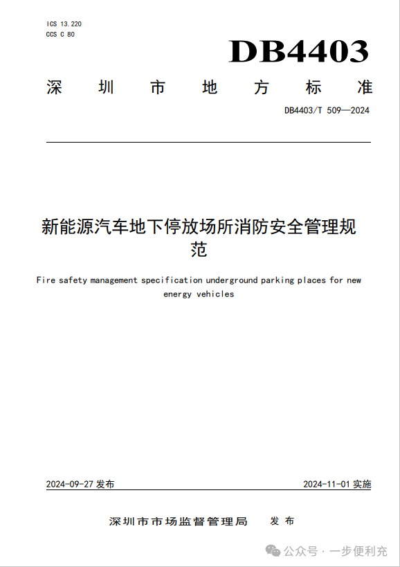 由深圳市消防救援支队提出并牵头编制的地方标准《新能源汽车地下停放场所消防安全管理规范》(DB4403 / T 509—2024,以下简称《规范》)正式发布,将于 2024 年 11 月 1 日开始实施。