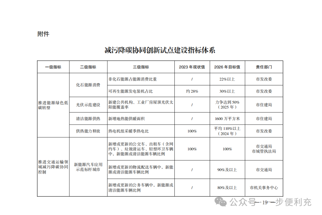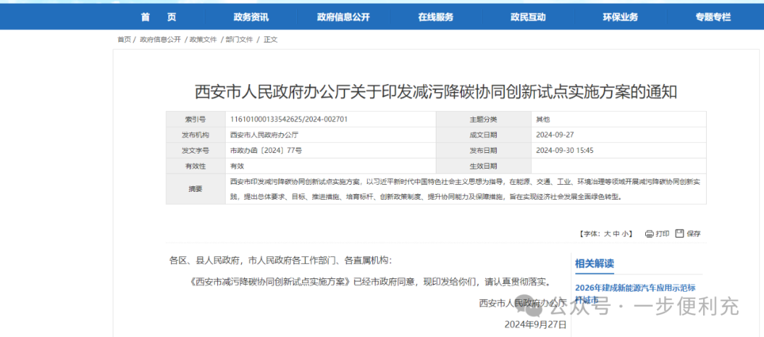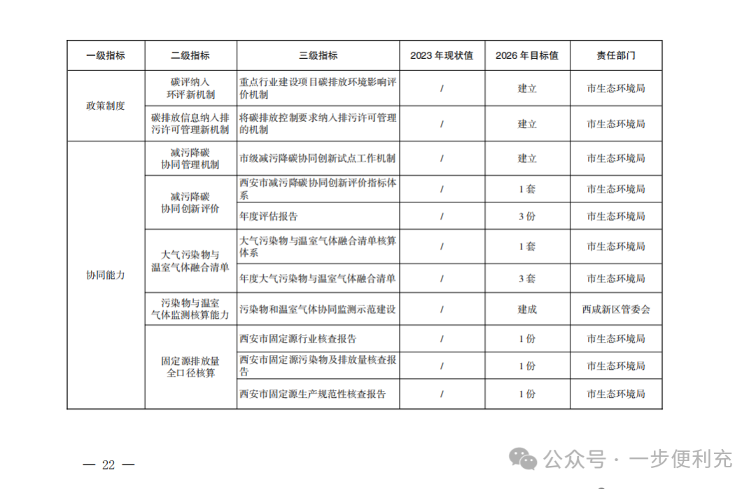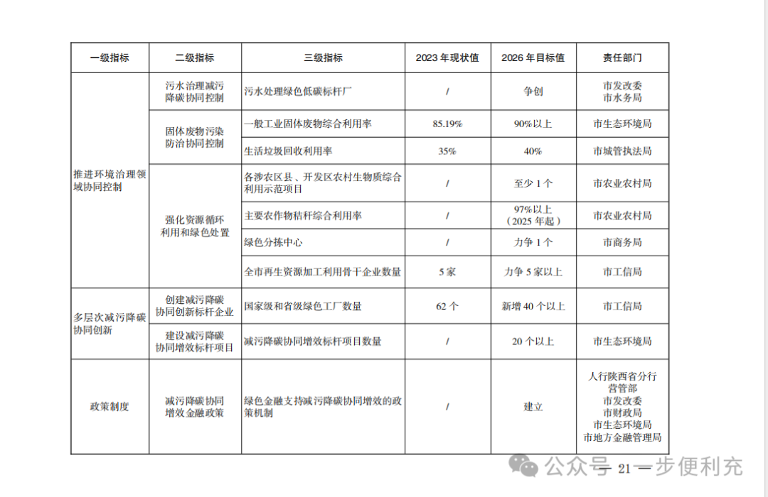 近日陕西省西安市政府获悉,《西安市减污降碳协同创新试点实施方案》(以下简称《方案》)近日正式印发,探索能源清洁化、产业绿色化、资源循环化的协同创新路径,促进西安市经济社会发展全面绿色转型和碳达峰碳中和目标实现。 《方案》指出:建成适度超前、布局合理、车桩相宜、智能高效的充电基础设施体系。鼓励具备技术优势、创新优势的智能充电科技企业参与充(换)电网络体系建设,建立信息数据互联互通、智能技术标准体系完善、运管管理机制健全的新型充(换)电基础设施体系。 推进既有交通基础设施节能降碳改造提升,建设一批低碳(近零碳)车站、机场、高速公路服务区。到2026年,全市公交车中新能源车占比达到93%以上,出租车(含网约车)中新能源车占比达到90%。主要城区形成半径不大于2公里的充(换)电服务圈,累计建设公(专)用充电场站2495座、公(专)用充电桩35689个,满足85万辆电动汽车的充(换)电需求。 -(原件如下)- (此件公开发布) 西安市减污降碳协同创新试点实施方案 为推进西安市减污降碳协同创新试点建设,促进城市可持续发展和绿色转型,根据生态环境部办公厅《城市和产业园区减污降碳协同创新试点工作方案》(环办综合函〔2023〕234号)和生态环境部综合司《关于印送减污降碳协同创新试点任务清单的函》(综合函〔2024〕18号)有关要求,结合我市实际,制定本方案。 一、总体要求 以习近平新时代中国特色社会主义思想为指导,全面贯彻党的二十大和二十届二中、三中全会精神,深入贯彻习近平生态文明思想和习近平总书记历次来陕考察重要讲话重要指示精神,立足黄河流域生态保护和高质量发展要求及国家中心城市特点,结合西安市用能结构、产业结构、减排空间,综合考虑大气污染形势严峻、地形气象条件不利等问题,以新能源应用示范为主线,在能源、交通、工业、环境治理等重点领域开展减污降碳协同创新实践。探索能源清洁化、产业绿色化、资源循环化的协同创新路径,促进西安市经济社会发展全面绿色转型和碳达峰碳中和目标实现,为建设“美丽西安”奠定基础,为全国同类型城市提供可复制可推广的“西安模式”。 (一)基本原则 ——全面统筹,协同增效。坚持统筹推进与重点突破相结合,统筹碳达峰碳中和与生态环境保护相关工作,推动能源、交通、工业、环境治理多领域减污降碳协同增效,以碳达峰行动进一步深化环境治理,以环境治理助推高质量达峰。 ——源头防控,协同发展。找准大气污染物和温室气体排放主要源头,将能源绿色低碳转型作为减污降碳的根本途径,开展新能源应用示范,推动能源供给体系清洁化低碳化,加快形成有利于减污降碳的用能结构、生产体系和消费模式。 ——创新政策,协同控制。基于现有生态环境制度体系,推动将温室气体排放纳入环境监测、环境影响评价、排污许可等现有环境监管机制,实现协同控制。探索建立金融激励政策,加强减污降碳工作在政策制度和市场机制等方面的统筹融合。 ——因地制宜,示范创新。结合西安市六大支柱产业优势和城市特点,因地制宜、分类分领域施策,形成各具特色的典型做法和有效创新模式。通过选典型立标杆,发挥示范引领作用,以点带面,实现多层次、多领域减污降碳协同增效。 (二)总体目标 到2026年,形成一套减污降碳协同创新管理机制、模式路径和政策举措,构建“4+3+3+6”减污降碳协同创新“西安模式”,即开展能源、交通、工业、环境治理4个领域的减污降碳协同创新,在园区、企业、项目3个层次培育和遴选减污降碳协同创新标杆,出台减污降碳协同增效金融政策、碳评纳入环评新机制、碳排放信息纳入排污许可管理新机制3项减污降碳协同创新政策,提升市级层面试点工作机制创新、减污降碳协同创新评价指标体系创建、大气污染物与温室气体融合清单编制、污染物与温室气体监测核算、固定污染源排放量全口径核算、协同管理创新6种减污降碳协同管理和创新能力。投资约262亿元,推进66个减污降碳协同创新重点项目建设,确保全市非化石能源占能源消费比重达到22%以上,单位GDP能耗、主要污染物总量减排和单位GDP二氧化碳排放降低率完成省上下达目标。碳排放强度下降与生态环境质量改善协同推进取得明显成效,减污降碳协同度达到同类型城市领先水平,绿色低碳循环发展的经济体系初步形成。 (三)年度目标 2024年度,建立减污降碳协同创新试点工作机制,印发试点实施方案、减污降碳协同创新典型遴选办法,建立评价指标体系。安排部署新能源汽车应用示范标杆城市打造,以及能源、交通、工业、环境治理等领域减污降碳协同创新重点任务、重点项目。加快推进高排放企业关停和退城搬迁。全市热电机组采暖季热电比平均达到110%,累计完成新能源或国六排放标准渣土车、商混车替代80%以上,完成A级、B级和绩效引领性企业不少于80家,完成238台燃气锅炉低氮燃烧深度改造任务,完成含喷涂工艺汽修企业面漆使用水性涂料替代不少于700家,完成25个重点项目。开展2024年减污降碳协同度评价和试点阶段性评估。 2025年度,持续推进新能源汽车应用示范标杆城市打造,以及能源、工业、交通、环境治理等领域减污降碳协同创新重点任务、重点项目的实施,全市减污降碳协同度有所提升。探索绿色金融支持减污降碳协同增效相