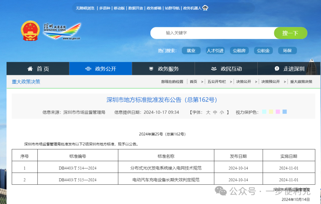 近日深圳市政府官网发布了深圳市地方标准批准发布公告(总第162号)。其中, 深圳市市场监督管理局批准发布了深圳市市场监督管理局批准发布《分布式光伏发电系统接入电网技术规范》、《电动汽车充电设备长期失效判定规范》2项地方标准,并于2024年11月1日开始实施。 在《电动汽车充电设备长期失效判定规范》中提到,本文件规定了电动汽车充电设备长期失效的认定要求、检验规则和检验结果判定。 本文件适用于长期未使用的电动汽车充电设备进行长期失效的判定活动。 -(原件如下)- 《电动汽车充电设备长期失效判定规范》 《电动汽车充电设备长期失效判定规范》解读 文件来源:深圳政府在线官网 |