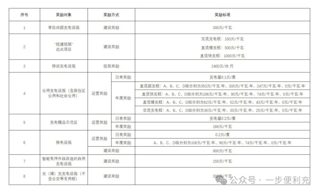 -(原件如下)- 2024年北京市电动汽车充换电设施建设运营奖励实施细则 为贯彻落实本市《关于进一步加强充电基础设施建设管理工作三年行动计划(2023—2025年)》《关于促进新能源汽车充电服务水平提升的工作措施》等有关要求,推动新能源汽车充换电服务水平提升,开展2024年度电动汽车充换电设施建设运营奖励工作,特制定该细则,原《2023年北京市电动汽车充换电设施建设运营奖励实施细则》同时废止。 一、奖励对象、方式及标准 (一)奖励对象及方式 1.对2023年9月1日—2024年5月31日建成的单位内部充电设施给予建设奖励。 2.对2023年9月1日—2024年5月31日期间完成“统建统服”试点项目评价,成功入围2024年度北京市居住区新能源汽车充电“统建统服”试点项目,并在后续通过项目建设验收和绩效评价的项目,给予建设奖励。 3.对2023年9月1日—2024年5月31日期间投入运营,且平均每月每车充电车次不少于10次、充电量不少于150度的移动充电设施,按月度给予投放奖励。 4.对2019年及以后建成投运(不含改造)的公用充电设施(含居住区公用和社会公用)在2023年9月1日—2024年5月31日期间的运营情况给予奖励,分为日常奖励和年度奖励,日常奖励以充电量为基准给予,年度奖励以功率为基准给予。 5.对充电精品示范区给予运营奖励,分为日常奖励和年度奖励,日常奖励以充电量为基准给予,年度奖励以功率为基准给予。 6.对2022年5月31日之前建成、在2023年9月1日—2024年5月31日期间运营的换电设施给予运营奖励,分为日常奖励和年度奖励,日常奖励以换电量为基准给予,年度奖励以功率为基准给予。对2023年9月1日—2023年12月31日期间建成的换电站给予一次性建设奖励。 7.对2023年9月1日—2024年5月31日期间新建(含改扩建)的光(储)充充电设施(不含公交等专用桩)给予建设奖励。对通过升级改造,具备有序充电功能的自用充电设施给予建设奖励。 以上奖补对象不重复支持。 (二)奖励标准 奖励标准见表1,其中年度奖励额应结合不同等级奖励标准和纳入奖励范围的具体天数给予。 表1 充换电设施建设运营奖励标准 二、实施方式 市城市管理委委托第三方机构北京国际工程咨询有限公司(广安门外大街甲275号)作为项目管理单位,由项目管理单位组织开展充换电设施建设运营奖励项目的申报、核查、评价及评审工作。 “统建统服”试点项目、充电精品示范区项目分别按照《关于征集2024年度北京市居住区新能源汽车充电“统建统服”试点建设项目的通知》《关于开展2023—2024年度北京市新能源汽车充电精品示范区项目申报有关工作的通知》相关要求开展。 三、申报条件 (一)申报单位营业执照的经营范围中含有电动汽车充换电设施建设运营、机动车充电销售、能源供应及设备研发生产等相关内容。 (二)申报单位须建立充换电设施安全生产管理制度,运维团队(含外包团队)需具有高/低压电工证、特种作业操作证、维修电工证、安全员证书或机电工程师等证书之一的专业人员。 (三)申报单位投资建设且接入市级公用充电设施数据信息服务平台的充换电设施总功率不低于3000千瓦[光(储)充充电设施、智能有序升级改造的自用充电设施等申报单位除外],并实现充换电设施状态信息互联互通,及时传送充换电订单数据。 (四)充换电设施的产品、建设施工、竣工验收、运营管理符合国家和本市相关标准规范要求。 (五)充换电设施应具有充电安全责任保险、火灾保险或公众责任险等保险之一。 (六)申报建设奖励的充换电设施未使用财政资金建设,未获得其他财政奖励(同一位置更换充电设施视为已获得建设奖励)。 四、项目申报 (一)申报主体:单位内部充电设施、移动充电设施、公用充电设施、换电设施、光(储)充充电设施由产权单位申报,智能有序升级改造的自用充电设施由项目服务商申报。 (二)申报方式:登录北京市人民政府门户网站“政策兑现”频道,选择相对应的项目申报进行申请。并将纸质版材料送至北京市西城区广安门外大街甲275号508。 (三)申报时间:2024年11月23日18:00截止。 (四)申报材料:申报单位提交项目申报书(附件2),所有项目申报材料不予退回。 五、评审评价 (一)材料初审。项目管理单位组织开展材料初审,将材料完整、合规的充换电设施纳入本年度奖励范围。 (二)平台监测。针对申报运营奖励的公用充电设施(含居住区公用和社会公用)、换电设施,市级公用充电设施数据信息服务平台对纳入奖励范围的充换电设施进行监测,形成监测报告。对存在持续未推送状态、持续掉线、持续故障、持续停运等情况超30天及考核期内平台未接收到订单的充换电设施,取消其奖励资格。 (三)现场核查。项目管理单位组织开展现场核查工作,结合市级公用充电设施数据信息服务平台监测情况,按照“申报单位全覆盖、行政区域全覆盖”原则,对充换电站设施数量及功率与申报内容一致性、运营状态进行现场核查。 (四)考核评价。针对公用充电设施、2022年5月31日之前建成的换电设施,从充电安全性、设施可用性、响应及时性及充电优质性等方面对充换电站进行综合评价(附件3)。针对单位内部充电设施、移动充电设施、光(储)充充电设施、智能有序升级改造的自用充电设施,从充电安全性进行评价,对于发生安全事故、有严重隐患或一般隐患整改不及时的充换电站,取消该站