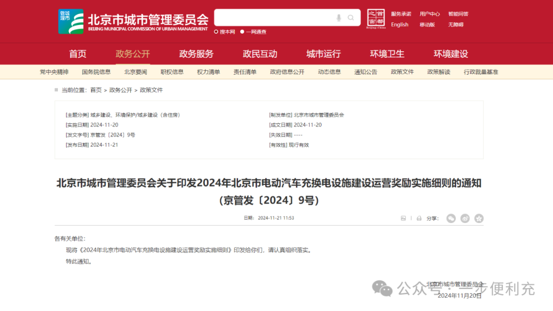 政策丨北京市城市管理委员会关于印发2024年北京市电动汽车充换电设施建设运营奖励实施细则的通知