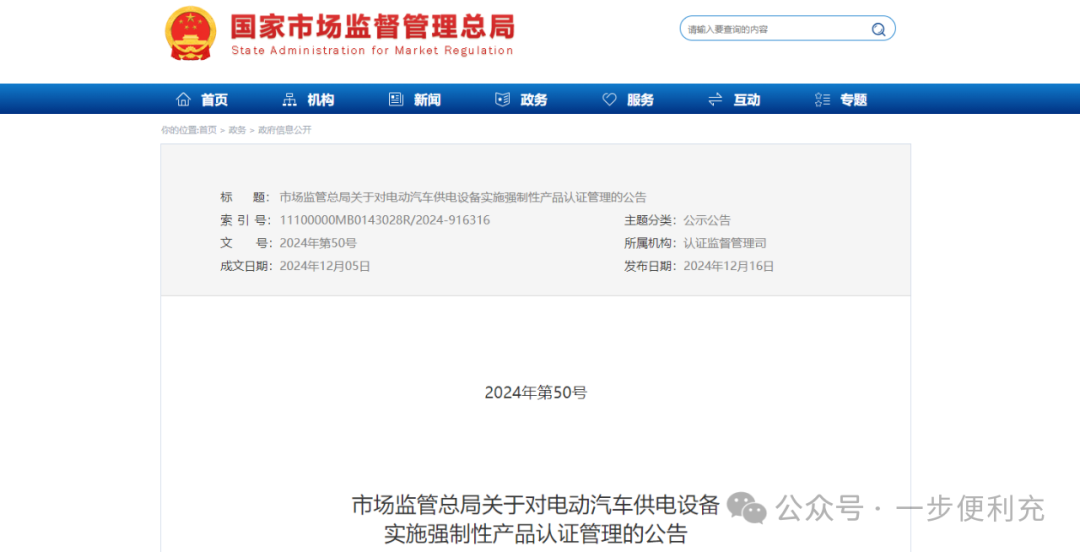 为进一步加强产品质量安全监管工作,根据《中华人民共和国认证认可条例》有关规定,市场监管总局决定对电动汽车供电设备实施强制性产品认证(CCC认证)管理。现将有关要求公告如下:一、2025年3月1日起,指定认证机构开始受理电动汽车供电设备(产品描述与界定见附件)CCC认证委托。承担相关认证、检测工作的认证机构和实验室另行公布。二、2026年8月1日起,未获得CCC认证证书和标注认证标志的电动汽车供电设备,不得出厂、销售、进口或者在其他经营活动中使用。三、指定认证机构应当依据CCC认证通用规则和对应产品实施规则制定认证实施细则,并向市场监管总局认证监管司备案后,方可开展认证工作。四、指定认证机构和实验室应当在认证风险可控、保证认证质量的前提下,积极采信已有合格评定结果,减轻企业负担,便利企业获证。