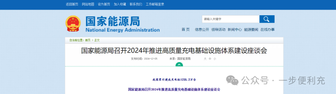 -(原件如下)- 国家能源局召开2024年推进高质量充电基础设施体系建设座谈会 12月24日,国家能源局在广东深圳召开2024年推进高质量充电基础设施体系建设座谈会,总结交流经验做法,研究部署下一步工作。国家能源局党组成员、副局长何洋出席座谈会并讲话。 会议指出,2024年是全国充电基础设施快速发展、产业业态不断丰富完善的一年。截至11月底,我国累计建成充电桩1235.2万台,同比增长50%;全国高速公路服务区累计建成充电桩3.31万台,覆盖了除港澳台外的全部省份。充电行业的快速健康发展,为绿色出行提供了坚强保障,为经济高质量发展注入了焕新活力,为实现“碳达峰、碳中和”目标提供了积极助力。 会议要求,下一步要继续全力推进高质量充电基础设施体系建设。要突出基础保障,构建均衡便捷的充电设施网络;突出供给质量,打造优质健康的产业生态;突出安全底线,建立全程可控的安全管理体系;突出创新能力,构筑充满活力的产业形态。国家能源局将深入贯彻落实党中央国务院工作部署,进一步加大政策供给,加强统筹规划布局,推动构建覆盖广泛、规模适度、结构合理、功能完善的高质量充电基础设施体系。 与会人员现场参观莲花山超级充电站、深圳虚拟电厂管理中心、华为数字能源总部等场所。有关部委、各省充电设施主管部门、行业协会、咨询机构、充电企业参加本次会议。 文件来源:国家能源局官网 |