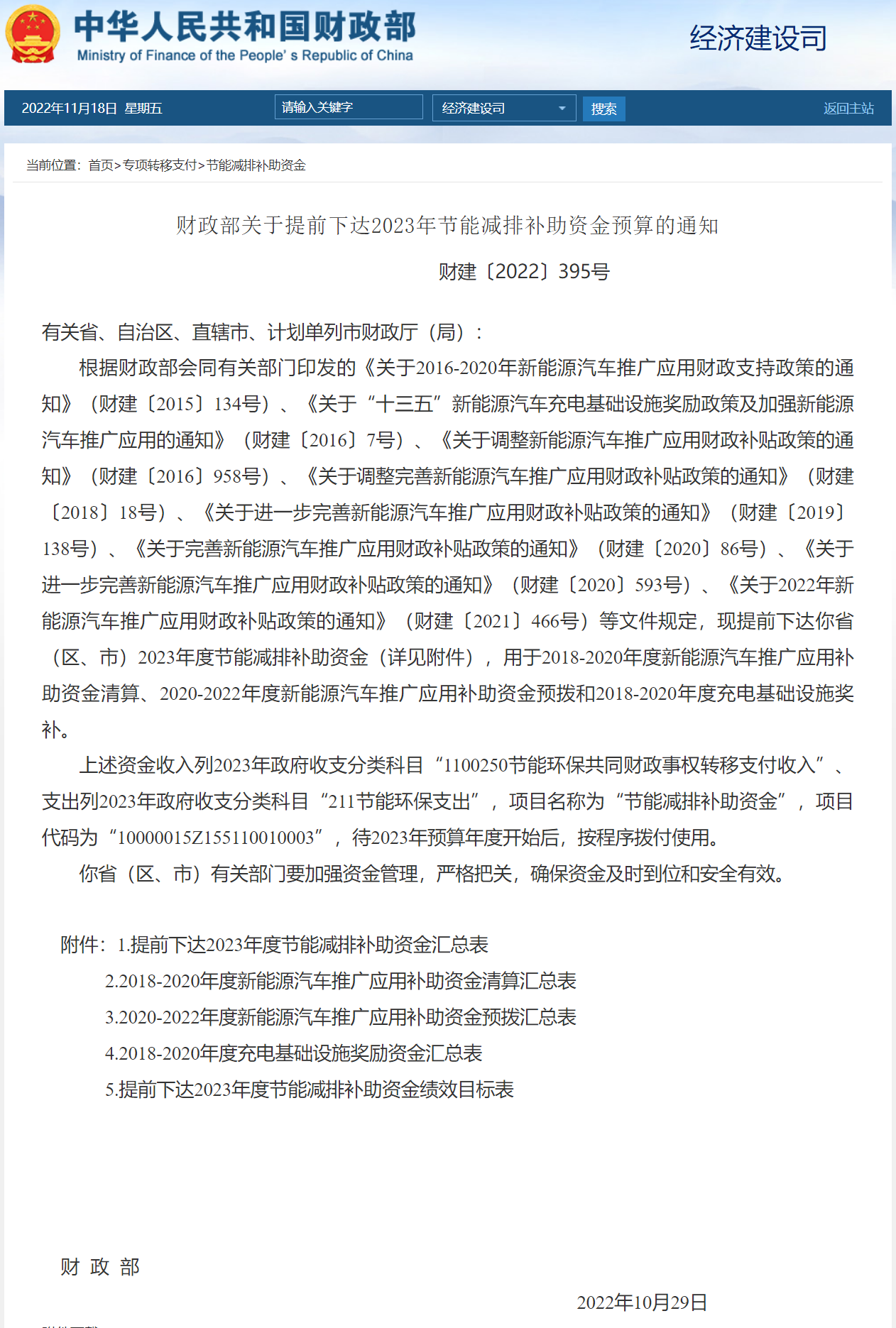 财政部关于提前下达2023年节能减排补助资金预算的通知