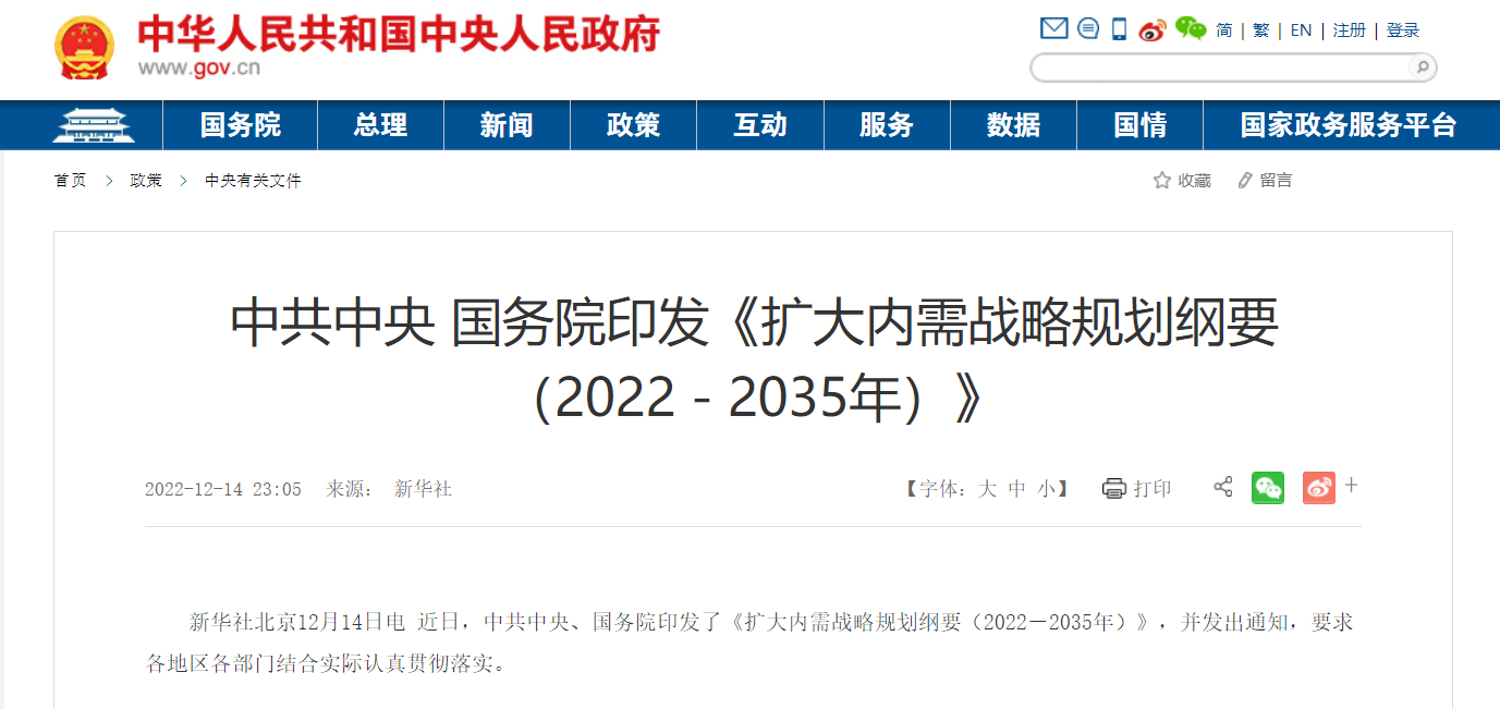 中共中央 国务院印发《扩大内需战略规划纲要(2022-2035年)》...